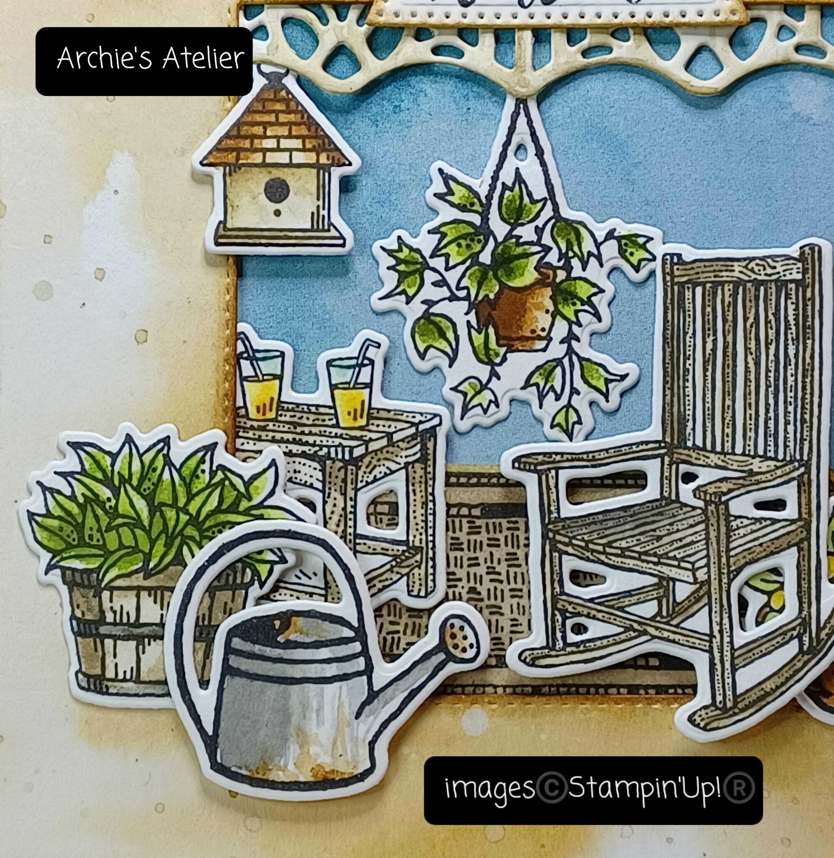 - Pecan Pie ink to colour flower baskets, bird house roof, to sponge edges of "welcome" banner (cut using the smallest banner die from Stylish Shapes dies), and to add "rust" to watering can;
