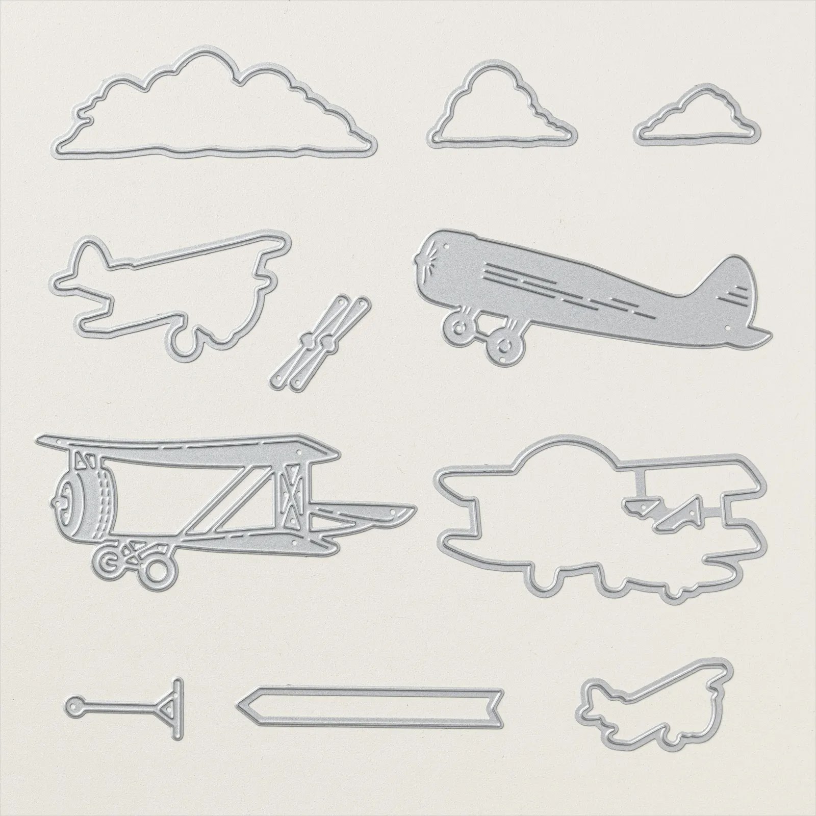 - for a nod to air mail, small airplane image from the retired Adventurous Sky stamp set (item 163439) - die cut using the retiring, and currently available as one of the discounted Last Chance products, Adventurous Sky dies (item 163446). The image was coloured using Crumb Cake and Basic Gray inks, with Early Espresso ink sponged around the die cut edges;
